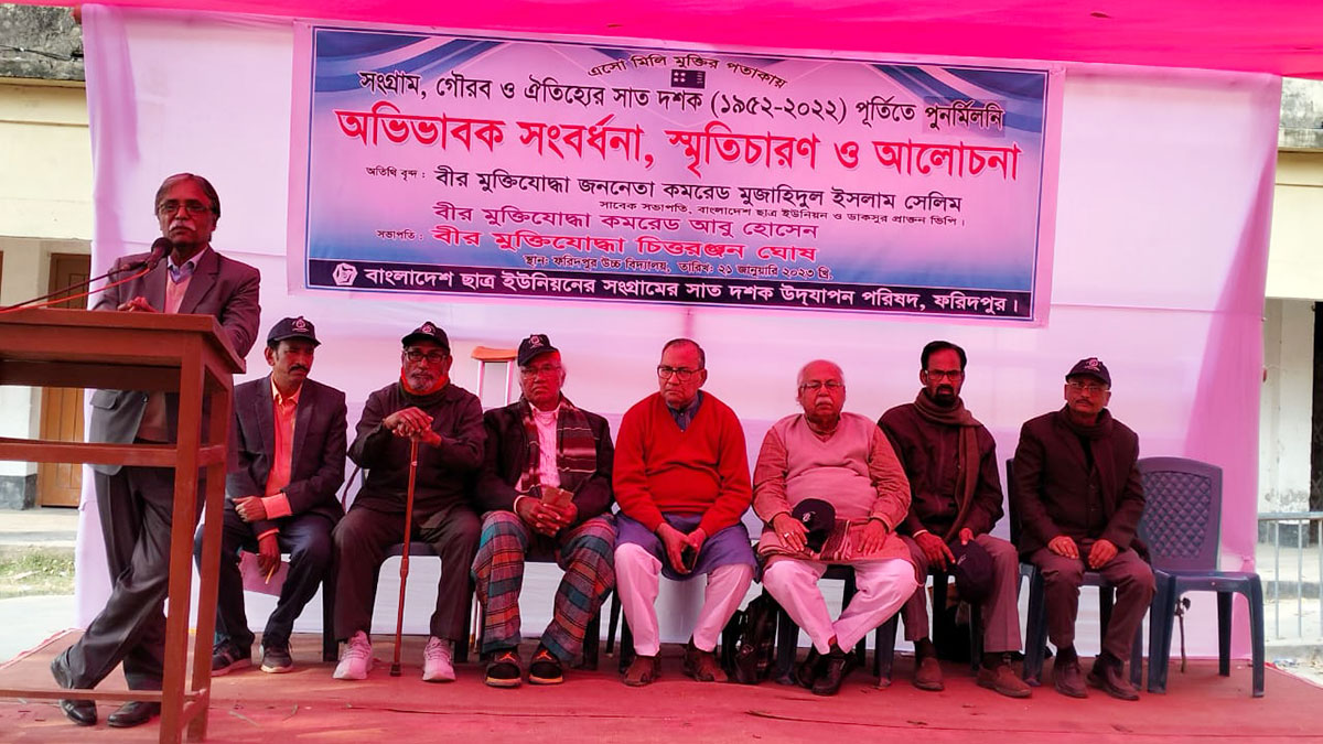 ছাত্র ইউনিয়নের সাত দশক (১৯৫২-২০২২) পূর্তি উপলক্ষে অভিভাবক সংবর্ধনা, স্মৃতিচারণ ও আলোচনা সভার আয়োজন করে ‘বাংলাদেশ ছাত্র ইউনিয়ন সংগ্রামের সাত দশক উদযাপন পরিষদ’। শনিবার (২১ জানুয়ারি) দুপুরে ফরিদপুর শহরের ফরিদপুর উচ্চ বিদ্যালয় প্রাঙ্গণে এ সমাবেশের আয়োজন করা হয় ‘এসো মিলি মুক্তির পতাকাতলে’ আহ্বানকে সামনে রেখে।