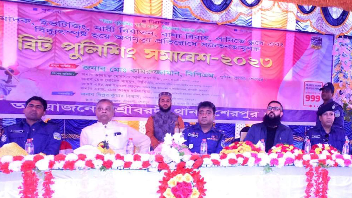 শেরপুরে সর্বসাধারণের মতামত, মাদক, ইভটিজিং, নারী নির্যাতন, বাল্যবিবাহ, পানিতে ডুবে ও বিদ্যুৎস্পৃষ্ট হয়ে অপমৃত্যু প্রতিরোধে জনসচেতনতা সৃষ্টি ও সমস্যা নিয়ে পুলিশের সঙ্গে বিট পুলিশিং সমাবেশ অনুষ্ঠিত হয়েছে।