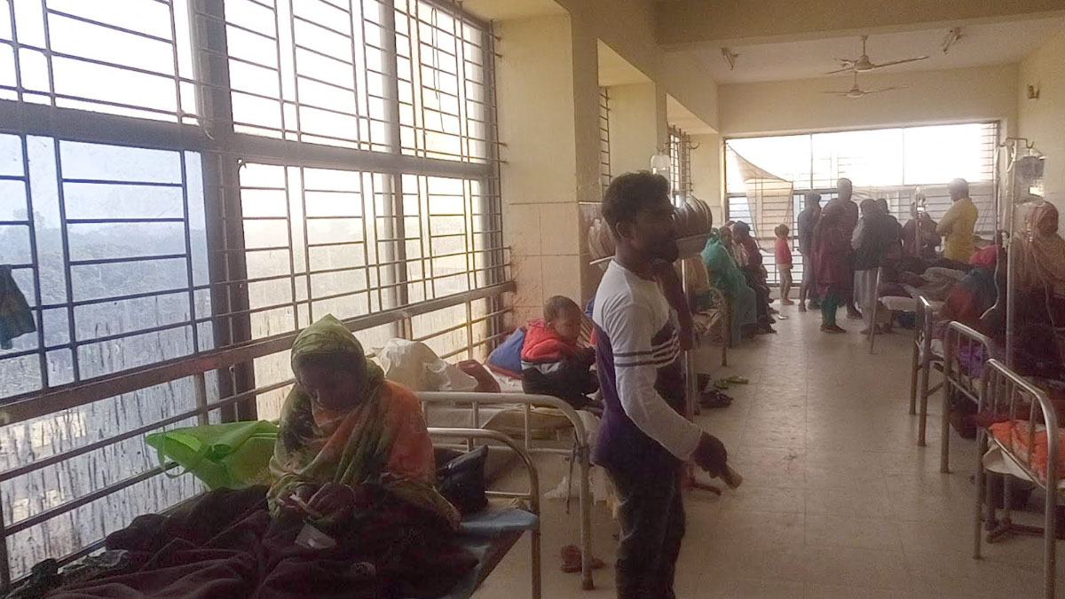 হাসপাতালের মেডিসিন বিভাগের বারান্দার দুই ধারে সারি সারি শুয়ে আছে রোগী। এরই মাঝে ভাঙা নারকেল বিক্রি করছেন এক ফেরিওয়ালা। নারকেলের খোলা ট্রে হাতে ‘এই নারকেল, নারকেল’ বলে চলছে তার ব্যবসায়ী প্রচারণা।