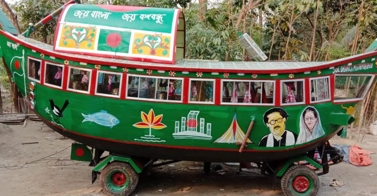 চার চাকার নৌকাটির দিকে তাকালে দেখা যায়, জাতীয় পতাকার লাল-সবুজ রঙে নৌকাটি সাজানো হয়েছে। বঙ্গবন্ধু ও প্রধানমন্ত্রী শেখ হাসিনার ছবিও আঁকা রয়েছে। নৌকায় ওঠার জন্য উড়োজাহাজের আদলে সিঁড়ি নির্মাণ করা হয়েছে।