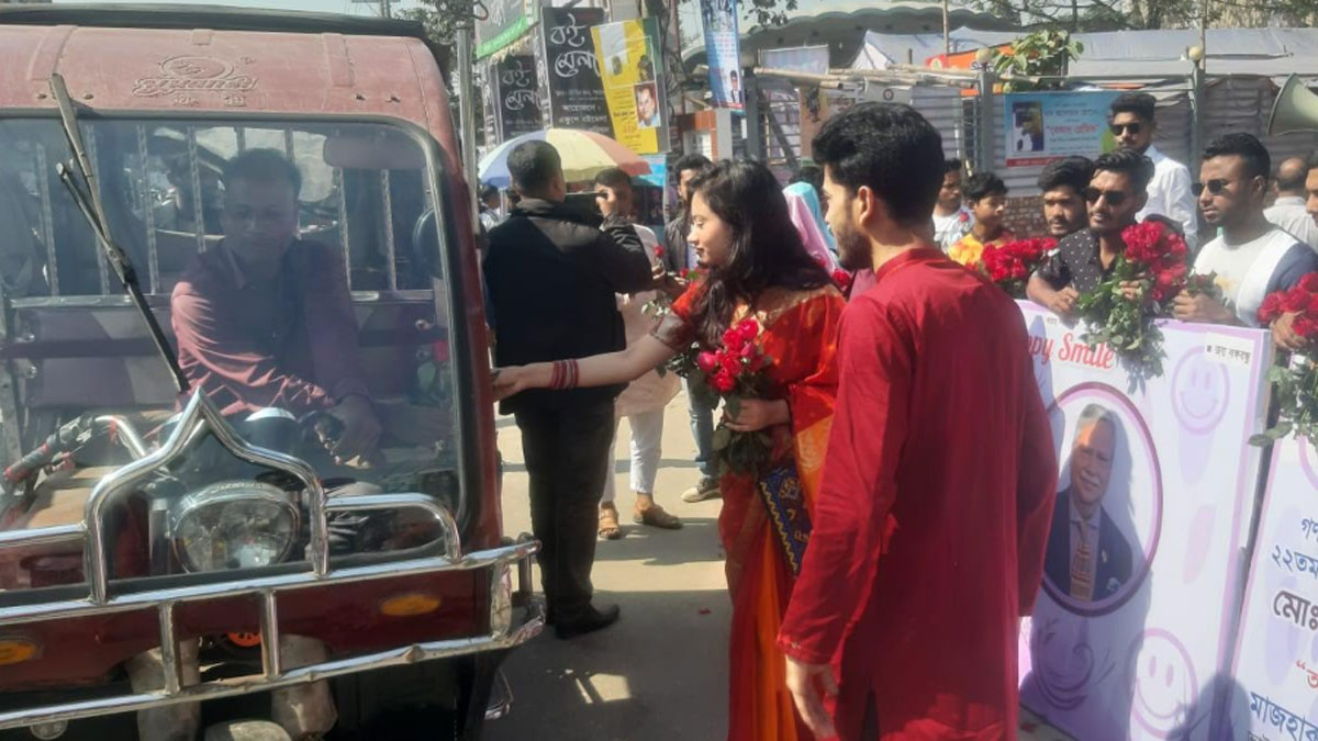 প্রথমে আব্দুল হামিদ রোডের ট্রাফিক মোড়ে রিকশাচালক, ভ্যানচালকসহ পথচারীদের হাতে গোলাপ ফুল তুলে দেন মাজহারুল ইসলাম মানিকের সমর্থকরা। দ্বিতীয় ধাপে বীর মুক্তিযোদ্ধা রফিকুল ইসলাম বকুল স্বাধীনতা চত্বরে সামনে পথচারীদের হাতে ফুল তুলে দেওয়া হয়।
