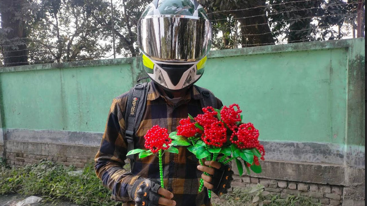 মঙ্গলবার (১৪ ফেব্রুয়ারি) দুপুরে রংপুর চিড়িয়াখানা রোডে হাতে প্লাস্টিকের ফুল নিয়ে দাঁড়িয়ে থাকতে দেখা যায় সিয়াম সাদিক নামের ওই তরুণকে। তিনি রংপুর মহানগরীর মাহিগঞ্জ কলেজের উচ্চ মাধ্যমিকের প্রথম বর্ষের শিক্ষার্থী। বিশ্ব ভালোবাসা দিবসে পছন্দের মানুষকে ফুল উপহার দিতে নয়, বরং ফুল বিক্রি করতেই অভিনব এই কৌশল তার। আর নিজের পরিচয় আড়ালে রাখতে মাথায় হেলমেট পরে বিক্রি করছেন নিজের তৈরি ফুল।