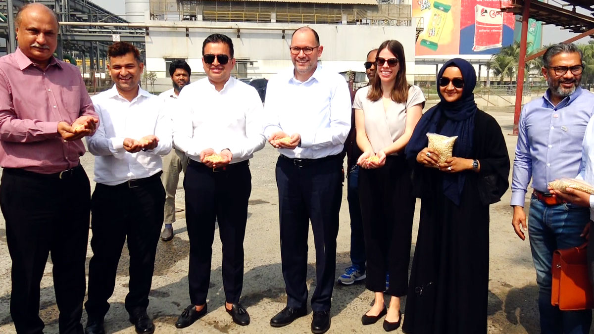 পরিদর্শনকালে মার্কিন রাষ্ট্রদূত সোনারগাঁ সিডস ক্রাশিং মিলস লিমিটেড ফ্যাক্টরিটিতে উৎপাদিত উচ্চমানের সয়াবিন মিল, রেপসিড কেক, এক্সট্রুডেড ফুল ফ্যাট (সয়া), সয়াবিন হাল, লিকুইড লেসিথিন, পাউডার লেসিথিন এবং লেসিথিন অয়েল দেখেন।