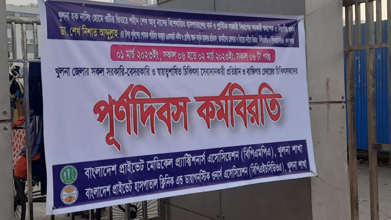 খুলনার সরকারি-বেসরকারি সব হাসপাতাল ও ক্লিনিকে চিকিৎসকদের পূর্ণদিবস কর্মবিরতি চলছে। শহীদ শেখ আবু নাসের বিশেষায়িত হাসপাতালের প্লাস্টিক সার্জারি বিভাগের বিভাগীয় প্রধান ডা. শেখ নিশাত আব্দুল্লাহর ওপর হামলার প্রতিবাদে চিকিৎসকরা এই কর্মসূচি পালন করছেন।