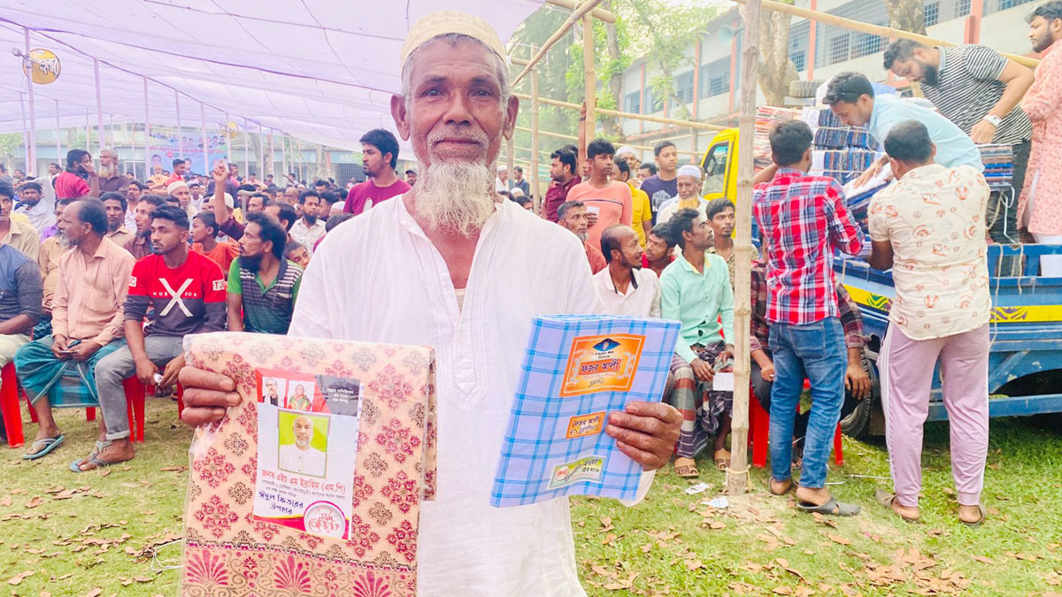 তিনি ঢাকা পোস্টকে বলেন, বাংলাদেশ জুটমিলের শ্রমিক ছিলাম। চার মেয়ে ও এক ছেলে নিয়ে আমাদের সাতজনের সংসার। বাজারে দারোয়ানের চাকরি নিয়েছি। পেটে-ভাতে সংসার চলছে। এমপি সাহেব শাড়ি ও লুঙ্গি দিয়েছেন। খুব খুশি হয়েছি।