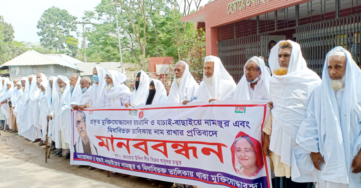 কাফনের কাপড় পরে বীর মুক্তিযোদ্ধাদের মানববন্ধন