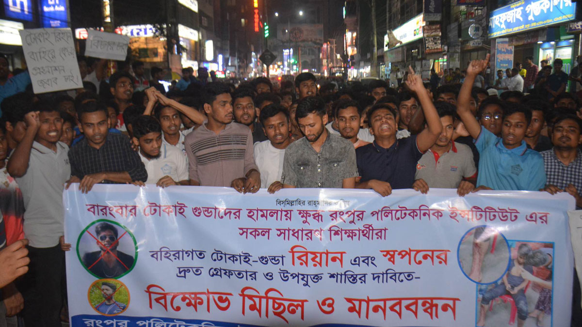 সোমবার (৩ এপ্রিল) বিকেলে রংপুর পলিটেকনিক ইনস্টিটিউটের ক্যাম্পাসে ওই শিক্ষার্থীকে রিহান ও স্বপন নামে স্থানীয় দুইজন বখাটে মারধর করে। এ ঘটনার প্রতিবাদে রাতে প্রেসক্লাব চত্বরে সড়ক অবরোধ করে বিক্ষোভ মিছিল ও অভিযুক্তদের গ্রেপ্তারসহ শাস্তির দাবি জানিয়েছে বিক্ষুব্ধ শিক্ষার্থীরা।