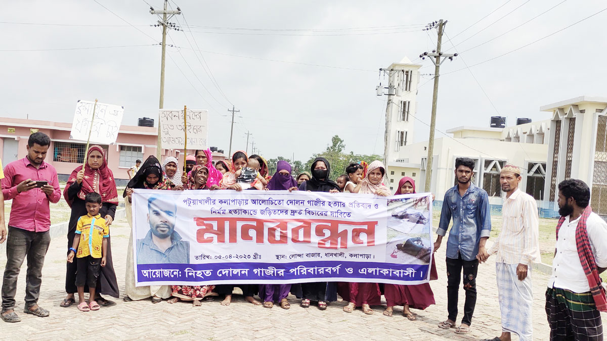 পটুয়াখালীর কলাপাড়ায় আলোচিত দোলন গাজীর হত্যার প্রতিবাদ ও হত্যাকাণ্ডের সঙ্গে জড়িতদের বিচারের দাবিতে মানববন্ধনে অংশগ্রহণ করেছে নিহতের দুই সন্তান আরাফাত (৬) ও আদনান (৩ মাস)। বুধবার (৫ এপ্রিল) সকালে কলাপাড়া উপজেলার ধানখালী ইউনিয়ের লোন্দাবাজারে এই মানববন্ধন অনুষ্ঠিত হয়।