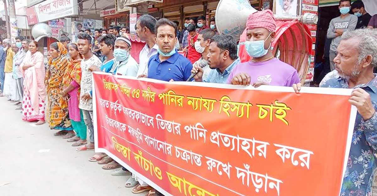 নেতারা আরও বলেন, ভারত আন্তর্জাতিক নদী আইন লঙ্ঘন করে তিস্তাসহ অভিন্ন ৫৪ নদীতে বাঁধ-ব্যারেজ নির্মাণ করে একতরফভাবে পানি প্রত্যাহার করছে। ভারতের পানি আগ্রাসনের কারণে বাংলাদেশের কৃষি ও জীবনরেখা আজ হুমকির মুখে। স্বাধীনতা-পরবর্তী ক্ষমতাসীন সব শাসকগোষ্ঠীর ভারতের প্রতি নতজানু নীতির কারণে বাংলাদেশ পানির ন্যায্য হিস্যা আদায়ে ব্যর্থ হয়েছে।