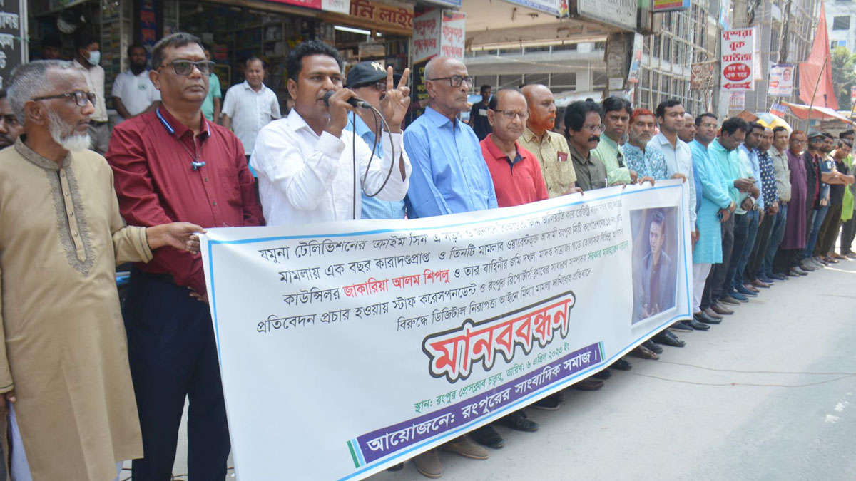 বক্তারা আরও বলেন, যমুনা টেলিভিশনের অপরাধ অনুসন্ধানমূলক অনুষ্ঠান ক্রাইম সিনে সড়ক ও জনপথ বিভাগের জমি জালিয়াতি করে রেজিস্ট্রি বায়না দলিল করা সংক্রান্ত মামলায় এক বছর দণ্ডপ্রাপ্ত ও তিনটি মামলার ওয়ারেন্টভুক্ত আসামি রংপুর সিটি করপোরেশনের ১৫ নম্বর ওয়ার্ডের কাউন্সিলর জাকারিয়া আলম শিপলু। তার বাহিনীর জমি দখল, মাদক সাম্রাজ্য গড়ে তোলাসহ বিভিন্ন অপকর্মের প্রতিবেদন টেলিভিশনে প্রচার হওয়ায় সাংবাদিকের বিরুদ্ধে ডিজিটাল নিরাপত্তা আইনে মিথ্যা মামলা দাখিল করা হয়েছে। ক্ষমতার অপব্যবহার করে কাউন্সিলর নিজেই সরকারের ভাবমূর্তি নষ্ট, জমি দখল ও আত্মসাৎ, হামলা-ভাঙচুর, ভয়ভীতি সৃষ্টি করেছেন, আবার তিনি সাংবাদিকের নামে মামলাও করবেন এটা মানা যায় না। ওই কাউন্সিলরের খুঁটির জোর কোথায় তা খুঁজে বের করতে হবে। এ ধরনের দুর্নীতিবাজ কাউন্সিলরের বিরুদ্ধে শাস্তিমূলক ব্যবস্থা নিতে হবে।