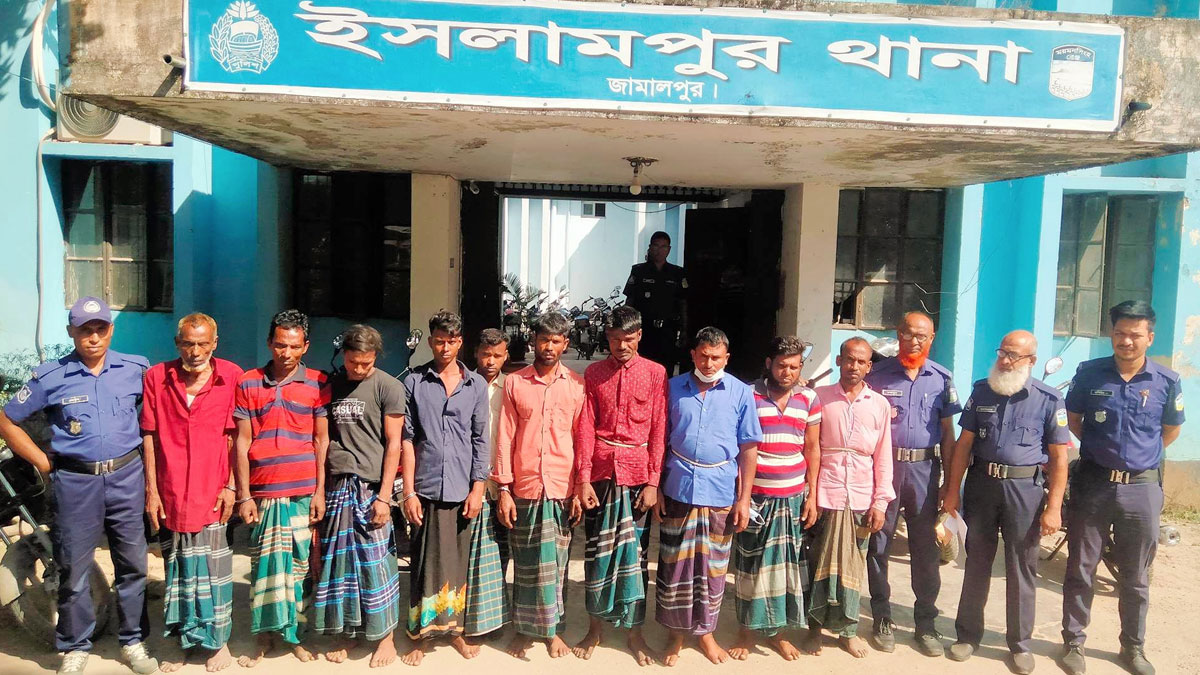 গ্রেপ্তারকৃতরা হলেন, উপজেলার নোয়ারপাড়া ইউনিয়নের ব্রহ্মত্তোর গ্রামের মৃত ছলিম উদ্দীন কাজীর ছেলে লুৎফর কাজী (৫০), তার ছেলে সহিজ উদ্দীন কাজী (২৭), লুৎফর রহমান শটকুর ছেলে নাজিম উদ্দীন (২৮), ধলকা গ্রামের ছবুর আলীর ছেলে রবিউল (২২), শামসুল হকের ছেলে নজরুল (৩০), সাইবালীর ছেলে আমিরুল (৩৮), পূর্ব চেঙ্গানিয়া গ্রামের মৃত আব্দুল ওয়াহেজের ছেলে ইউসুফ আলী (৪০), পার্শ্ববর্তী গাইবান্ধা জেলার সাঘাটা উপজেলার শিবি গারামারা গ্রামের আব্দুস সাত্তার মণ্ডলের ছেলে ওলুবদ্দিন (৫০), মৃত নজরুল ইসলামের ছেলে সাহাদুল ইসলাম (২৮), এবং আব্দুস সাত্তারের ছেলে জিয়াউল (৩২)।