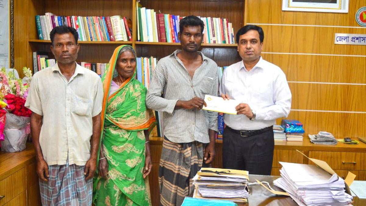 কৃষক মুকুলকে অর্থ সহায়তা করছেন জেলা প্রশাসক শামীম আহমেদ