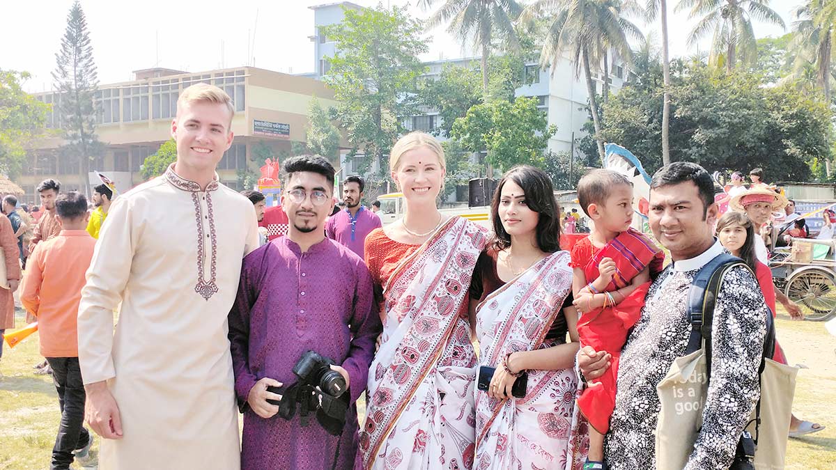 শুক্রবার (১৪ এপ্রিল) পহেলা বৈশাখের দিন সকালে যশোর টাউন হল ময়দানে হঠাৎ দেখা মেলে এই বিদেশি দম্পতির। নিজেদের ফোন, ক্যামেরায় বাঙালির সাজ, কারুকার্য এবং ঢাকের তালে তালে নৃত্য ধারণ করতে দেখা যায় তাদের। আবার অনেকে এ বিদেশি দম্পতির সঙ্গে কুশলাদি বিনিময় করছেন। আবার অনেকে সেলফি তুলতে ব্যস্ত। তারা যশোর আইটি পার্ক হোটেলের অতিথি।
