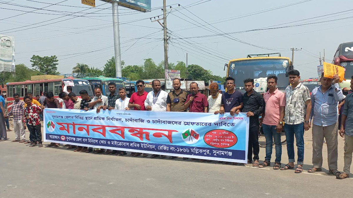 রোববার (১৬ এপ্রিল) দুপুরে সুনামগঞ্জ কেন্দ্রীয় বাস টার্মিনালে এই মানববন্ধন কর্মসূচি পালন করে সুনামগঞ্জ জেলা বাস মিনিবাস কোচ ও মাইক্রোবাস শ্রমিক ইউনিয়ন। সংগঠনের সভাপতি সুজাউল কবিরের সভাপতিত্বে মানববন্ধনে বক্তব্য রাখেন সংগঠনের সাধারণ সম্পাদক মো. নুরুল হক, কার্যকরী সভাপতি বোরহান উদ্দিন, সুনামগঞ্জ জেলা সড়ক পরিবহন মালিক সমিতির সাধারণ জহিরুল ইসলাম।