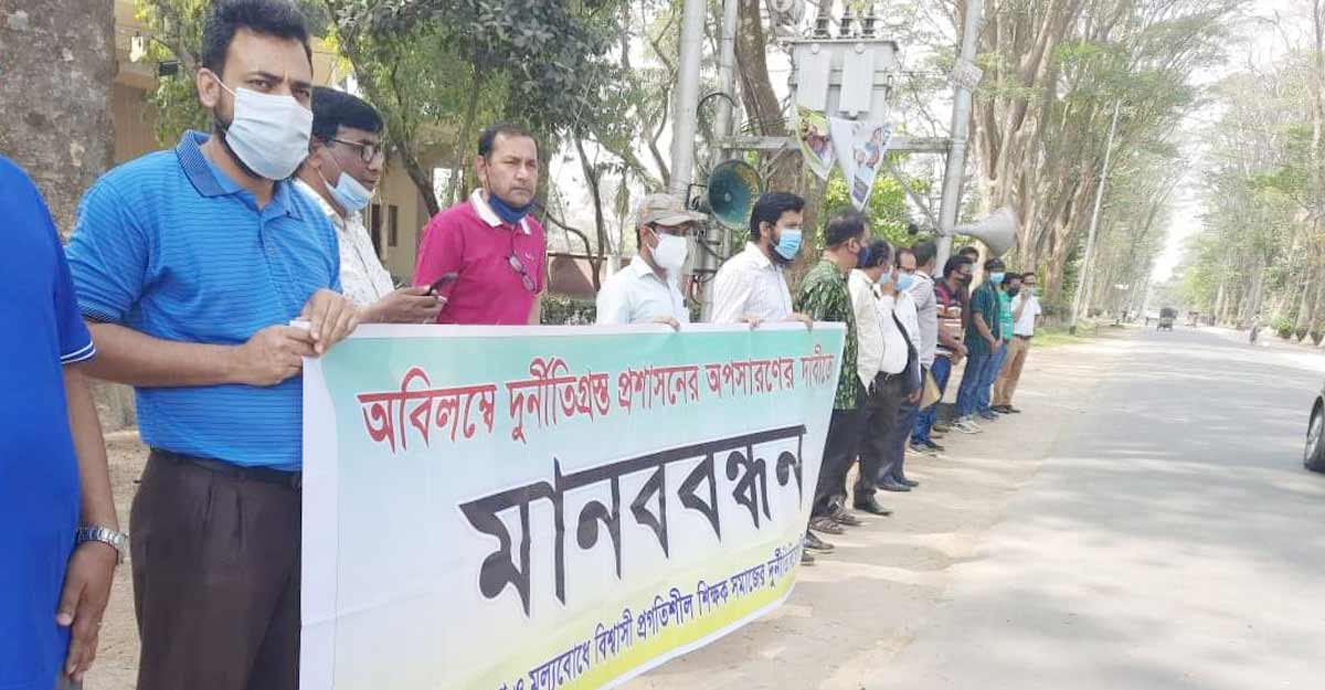 রাজশাহী বিশ্ববিদ্যালয়ের (রাবি) বর্তমান প্রশাসনকে দুর্নীতিগ্রস্ত আখ্যা দিয়ে অবিলম্বে অপসারণের দাবি জানিয়েছে মুক্তিযুদ্ধের চেতনা ও মূল্যবোধে বিশ্বাসী প্রগতিশীল শিক্ষক সমাজ। রোববার (২১ মার্চ) বেলা ১১টার দিকে প্যারিস রোডে এক মানববন্ধনে এ দাবি জানান তারা।