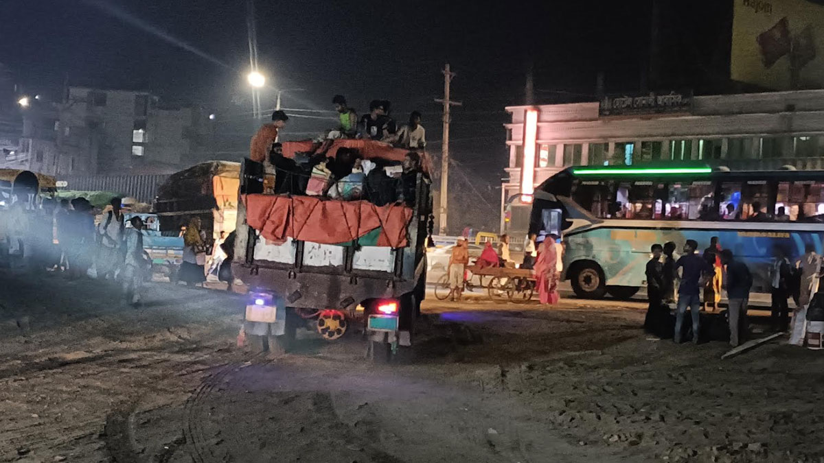 মঙ্গলবার (১৮ এপ্রিল) রাত ১১টার দিকে ঢাকা-আরিচা মহাসড়কের সাভারের আমিনবাজার বাসস্ট্যান্ডে এমন মানুষের ভিড় দেখা যায়। সড়কে গাড়ি নেই, ভাড়াও বেশি বলে দাবি করেছেন তারা।