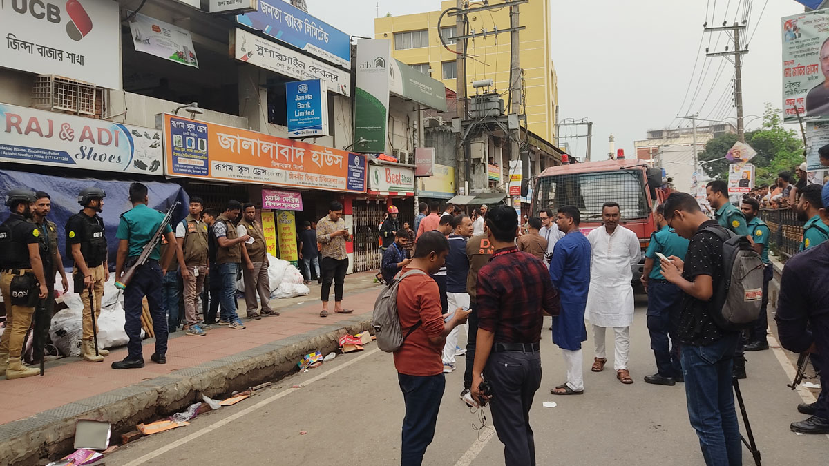 পুলিশ কর্মকর্তা আজবাহার আলী শেখ জানান, জালালাবাদ হাউস মার্কেটের তৃতীয় তলার একটি জুতার গোডাউন থেকে আগুনের সূত্রপাত হয়। সঙ্গে সঙ্গে পুলিশ, ডিবি, এপিবিএন, সিআরটিসহ বেশ কয়েকটি বাহিনী সার্বিক আইন-শৃঙ্খলা পরিস্থিতি নিয়ন্ত্রণে কাজ করেন। খবর পেয়ে ফায়ার সার্ভিসের ছয়টি ইউনিট আগুন নিয়ন্ত্রণের জন্য আসলেও তিনটি ইউনিটের চেষ্টায় আগুন নিয়ন্ত্রণে আসে। এ ঘটনায় ক্ষয়ক্ষতির পরিমাণ এখনো বলা যাচ্ছে না। আর কী কারণে আগুনের সূত্রপাত তা জানা যায়নি।