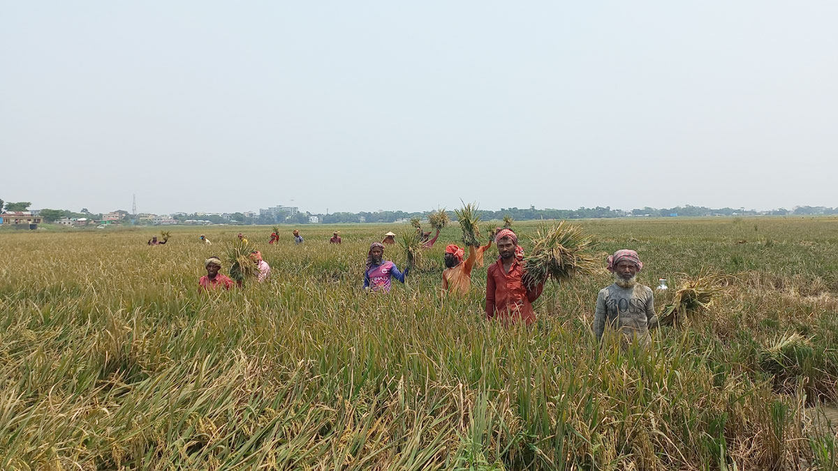 মাথার ওপর প্রখর রোদ। রোদ থেকে বাঁচতে কেউ গামছা কিংবা কেউ মাথাল মাথায় কাটছেন ধান। মাথার ঘাম নাক বেয়ে টপটপ করে ঝড়ছে কৃষকের, তারপরও মুখে ঝলমলে হাসি।