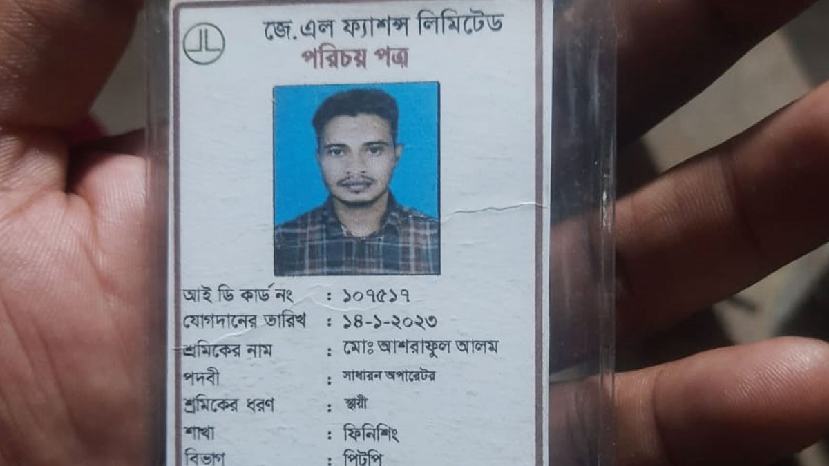 নিহত আশরাফুল আলম নেত্রকোণার মোহনগঞ্জ থানার করাচাপুরের কানুহারী গ্রামের ওমর ফারুকের ছেলে। তিনি গাজীপুরের বাঘেরবাজার এলাকায় জে এল ফ্যাশন্স লিমিটেড নামে একটি পোশাক কারখানায় চাকরি করতেন।