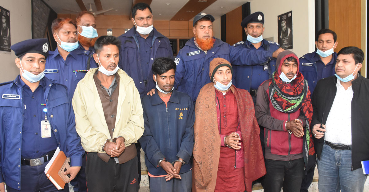 গ্রেফতাররা হলেন- একই এলাকার তোজাম্মেল হকের ছেলে স্থানীয় জিএমসি ডিগ্রি কলেজের বিএ দ্বিতীয় বর্ষের ছাত্র বাপ্পি আহমেদ (২২), দলিল উদ্দিন সরকারের ছেলে মুদি দোকানদার কামাল পাশা (৩৫), সানোয়ার হোসেনের ছেলে রাজমিস্ত্রী শামীম রেজা (২২) এবং মৃত সাহেব আলী শেখের ছেলে রংমিস্ত্রি লাবলু শেখ (২১)।