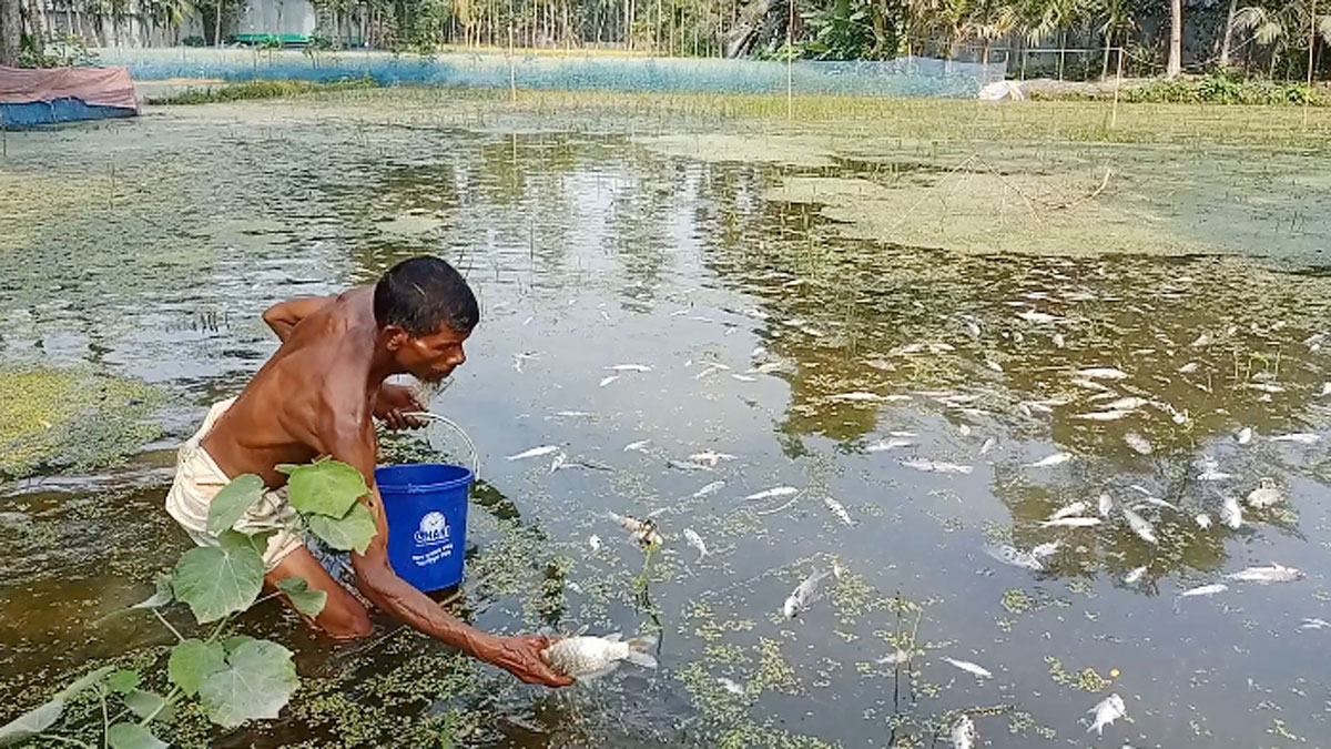 বৃহস্পতিবার (১১ মে) দুপুরে রাজিব মোল্লাটারী গ্রামে গিয়ে দেখা গেছে, পুকুরে মাছ মরে ভেসে আছে। মাছচাষি পুকুর থেকে মরা মাছগুলো তুলে পাশে মাটিতে পুঁতে রাখছেন। প্রায় ২০ মণ মাছ মরে পচে গেছে বলে জানান এই কৃষক।