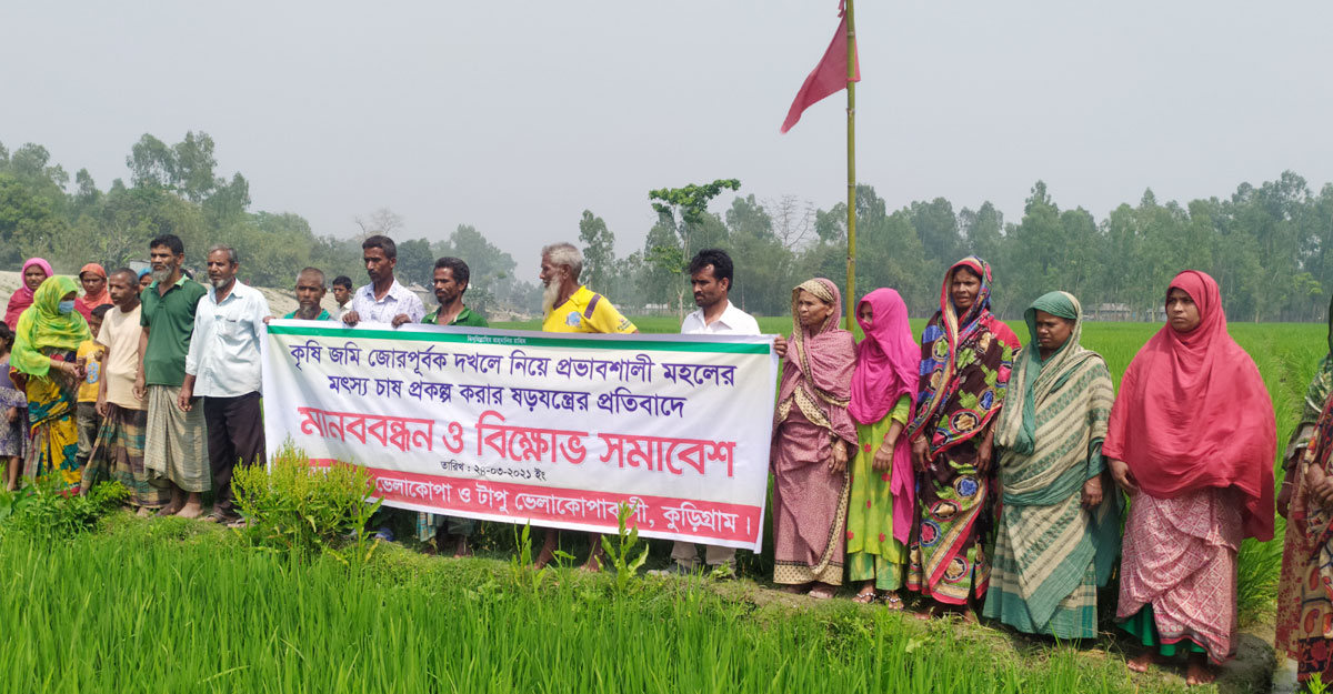 কুড়িগ্রাম সদরের ভেলাকোপা ও টাপু এলাকায় কৃষি জমিতে জোর করে মাছের প্রজেক্ট করার প্রতিবাদে মানববন্ধন করেছেন দুই গ্রামের মানুষ। বুধবার (২৪ মার্চ) দুপুরে লাল নিশান উড়ানো জমিতে তারা মানববন্ধন করেন। পরে সড়কে গিয়ে বিক্ষোভও করেন এলাকাবাসী।