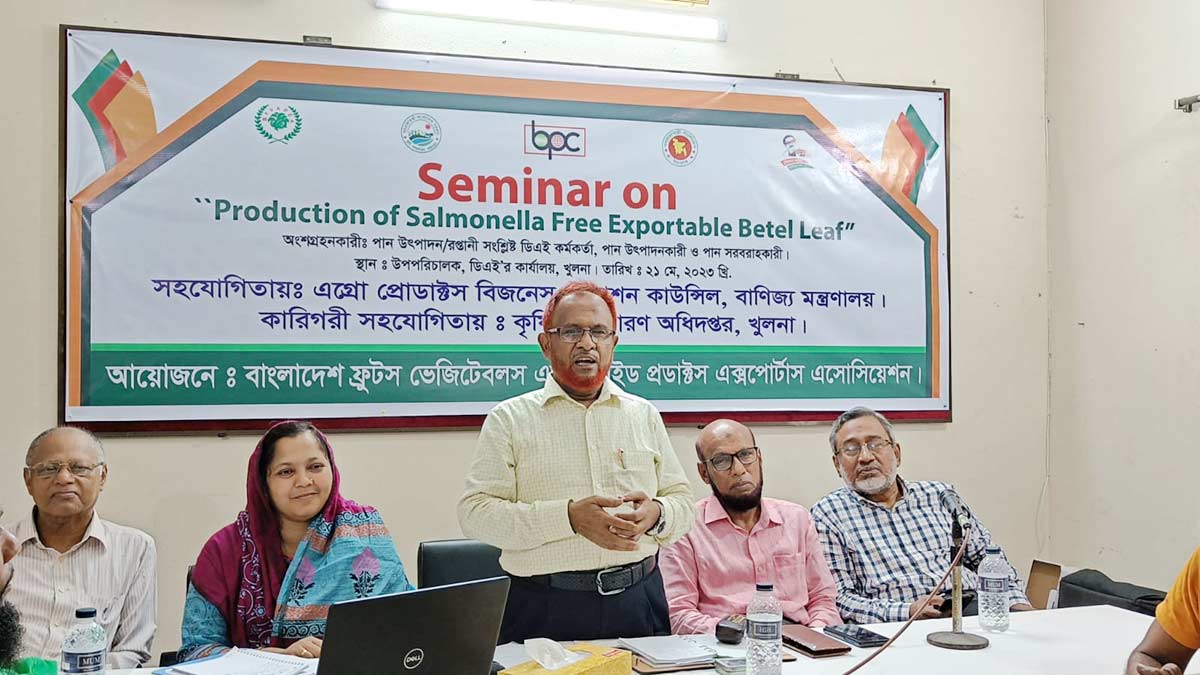 খুলনায় 'সেলমোনেলা মুক্ত রপ্তানিযোগ্য পান উৎপাদন' শীর্ষক সেমিনার অনুষ্ঠিত হয়েছে। রোববার (২১ মে) খুলনা কৃষি সম্প্রসারণ অধিদপ্তরের উপপরিচালকের কার্যালয় এই সেমিনার অনুষ্ঠিত হয়।
