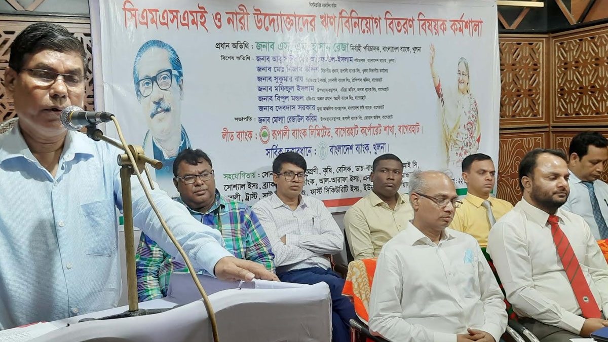 বাগেরহাটে সিএমএসএমই ও নারী উদ্যোক্তাদের ঋণ বিতরণ বিষয়ক কর্মশালা অনুষ্ঠিত হয়েছে। দেশের অর্থনীতিতে নারীদের অংশগ্রহণ নিশ্চিত ও প্রান্তিক পর্যায়ে নারী উদ্যোক্তা তৈরির উদ্দেশ্যে বাংলাদেশ ব্যাংকের আয়োজনে বাগেরহাট শহরের ক্যাসেল আসারা নামক একটি হোটেলের মিলনায়তনে সোমবার (২২ মে) এই কর্মশালা অনুষ্ঠিত হয়।