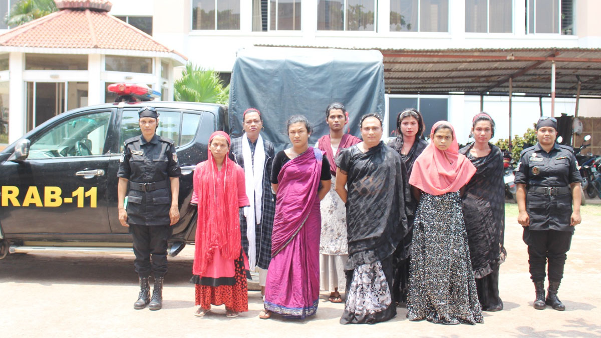আটককৃতরা হলেন- রফিক ওরফে ললিতা (৪০), রবি আলম ওরফে বিউটি (৪০), একরাম ওরফে পরীমনি (২২), রবি আলম ওরফে প্রিয়া (২৪), মো. আল-আমিন ওরফে নিশি (৩৫), রায়হান ওরফে আঁখি (২০), সাবের ওরফে বিজলী (২২) ও ফারুক ওরফে রিয়ামনি (২৫)। তারা সবাই কক্সবাজার জেলার বাসিন্দা বলে জানায় র্যাব।
