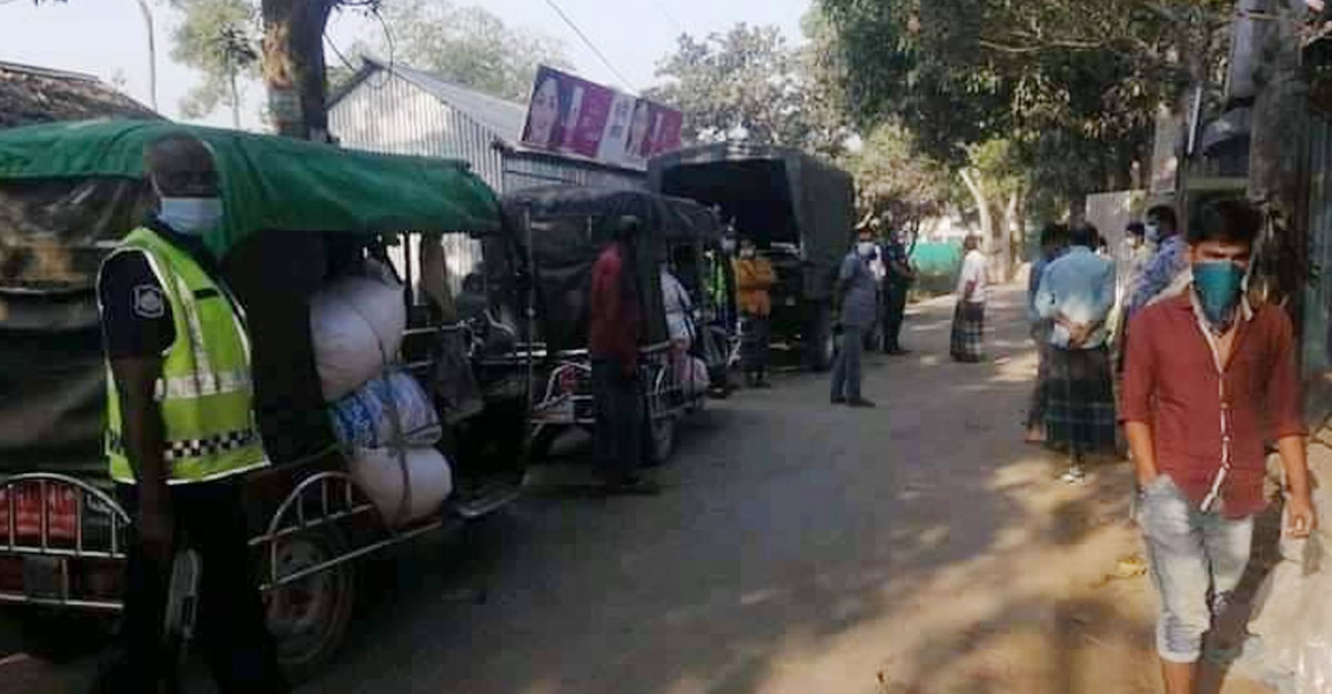 পুলিশ পাহারায় আটক চাল নিয়ে যাওয়া হচ্ছে