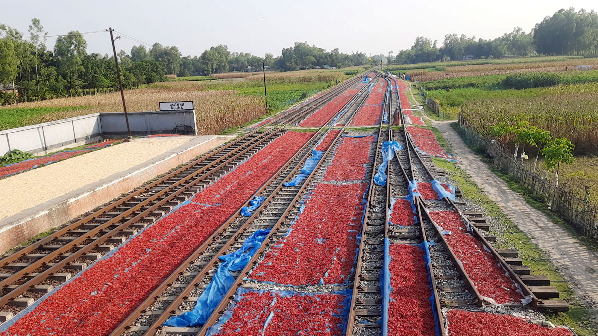 বৃহস্পতিবার (২৫ মে) সকালে ঠাকুরগাঁওয়ের রুহিয়া রেলস্টেশন এলাকায় দেখা যায়, লাল মরিচের সমারোহ। রেললাইনের শুকনা মাটিতে পাটির উপরে শুকাতে দেওয়া হয়েছে লাল মরিচ। এ রেলগেট এলাকাতেই প্রতিদিন আশপাশের কয়েকটি এলাকার চাষিরা মরিচ শুকাতে আসেন। এছাড়া এখান থেকেও পাইকারি দরে মরিচ কিনে নেন ব্যবসায়ীরা।
