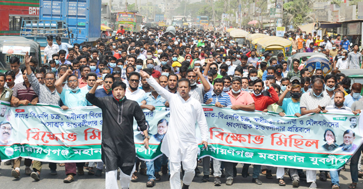 যুবলীগের নেতাকর্মীরা চাষাঢ়া থেকে বিক্ষোভ মিছিল বের করেন