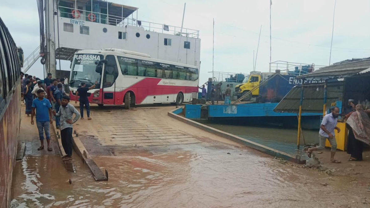 দীর্ঘদিন বন্ধ থাকা ৬ নম্বর ইউটিলিটি ফেরিঘাট সোমবার সকালে চালু হলেও সড়ক থেকে পন্টুন নিচু হওয়ায় ফেরিতে ঝুঁকি নিয়ে গাড়ি ওঠানামা করছে। ৭ নম্বর ঘাটের র্যামের পানিতে তলিয়ে যাওয়ায় দুপুর দেড়টার দিকে ঢাকাগামী যাত্রীবাহী বাস উঠতে না পেরে আটকে আছে। পাশের পন্টুন দিয়ে ঝুঁকি নিয়ে গাড়ি ওঠানামা করছে। পারাপার ব্যাহত হওয়ায় ঘাটে প্রায় দেড় কিলোমিটার লম্বা দুই লাইনে ঢাকাগামী পশুবাহী গাড়িসহ বিভিন্ন গাড়ি ফেরির নাগাল পাওয়ার অপেক্ষায় রয়েছে। ফেরিতে ওঠার সময় গাড়ির পিছনের অংশ ক্ষতিগ্রস্ত হয়।