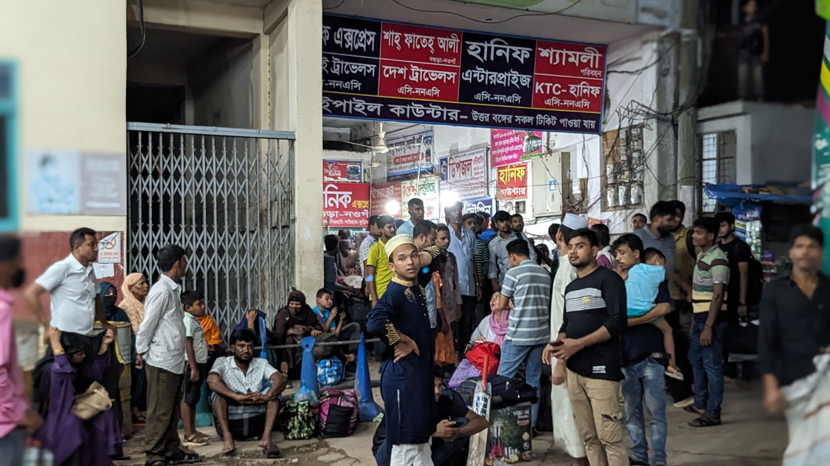 আশুলিয়ার বাইপাইল বাস স্ট্যান্ডে পোশাকশ্রমিক সাজ্জাদ হোসেন তার ভাইকে গাড়িতে তুলে দিতে এসেছেন রাত ১০টার সময়। চেয়ারকোচ গাড়ির টিকিট না পেয়ে লোকাল গাড়িতে ভাইকে তুলে দেওয়ার চেষ্টা করছেন। নরমাল সময় বাইপাইল থেকে বগুড়ার ভাড়া ৪৫০/৫০০ টাকা। কিন্তু লোকাল বাসের ভাড়াই নিচ্ছে ৯০০/৯৫০ টাকা। তবে হানিফ, শ্যামলী, অরিন ও অন্যসব কাউন্টারের গাড়ির টিকিটের দাম আগের মতই নিচ্ছে।