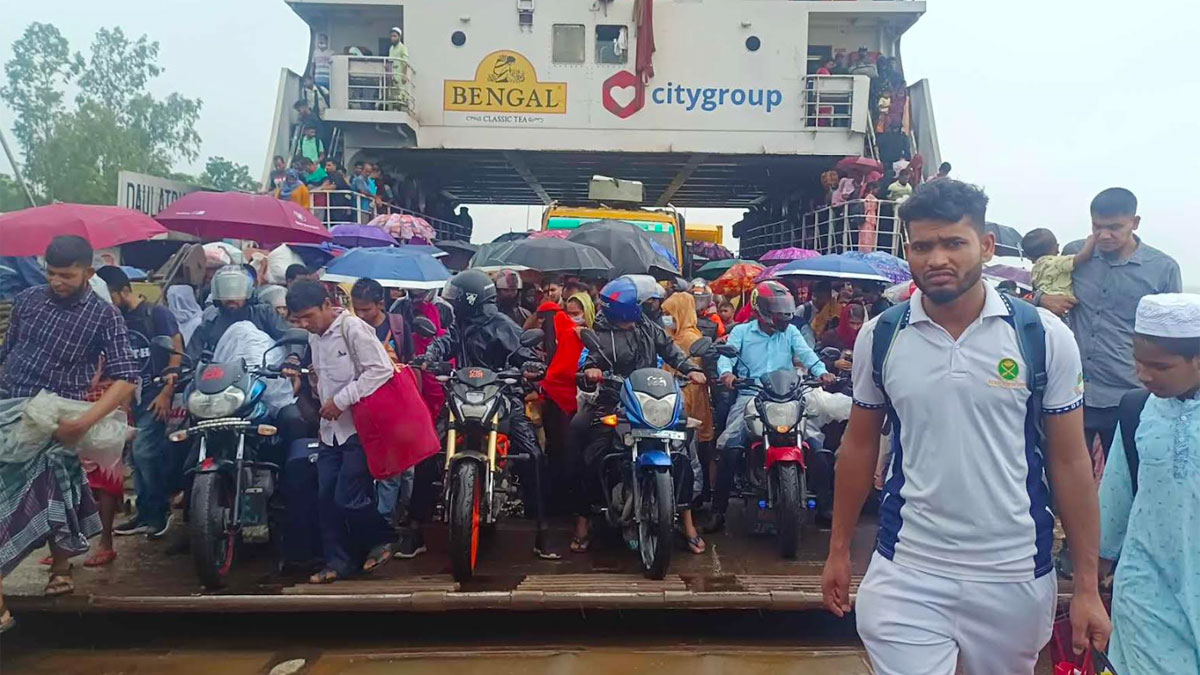 বৃষ্টি উপেক্ষা করেই দৌলতদিয়া ঘাটে ঘরে ফেরা মানুষের ঢল