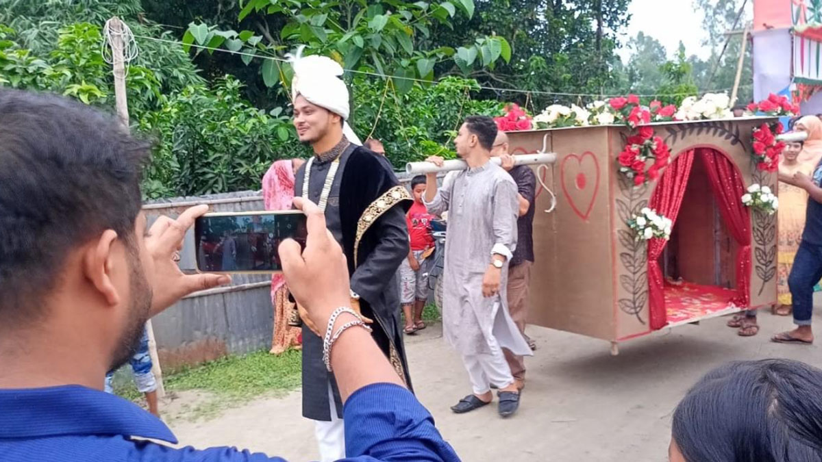 শনিবার (১ জুলাই) এমন দৃশ্য দেখা গেছে কুড়িগ্রামের চিলমারী উপজেলার রমনা এলাকায়। বর জাকারিয়া সরকার স্ত্রীকে বরণ করতে এই ব্যতিক্রমী উদ্যোগ নেন।
