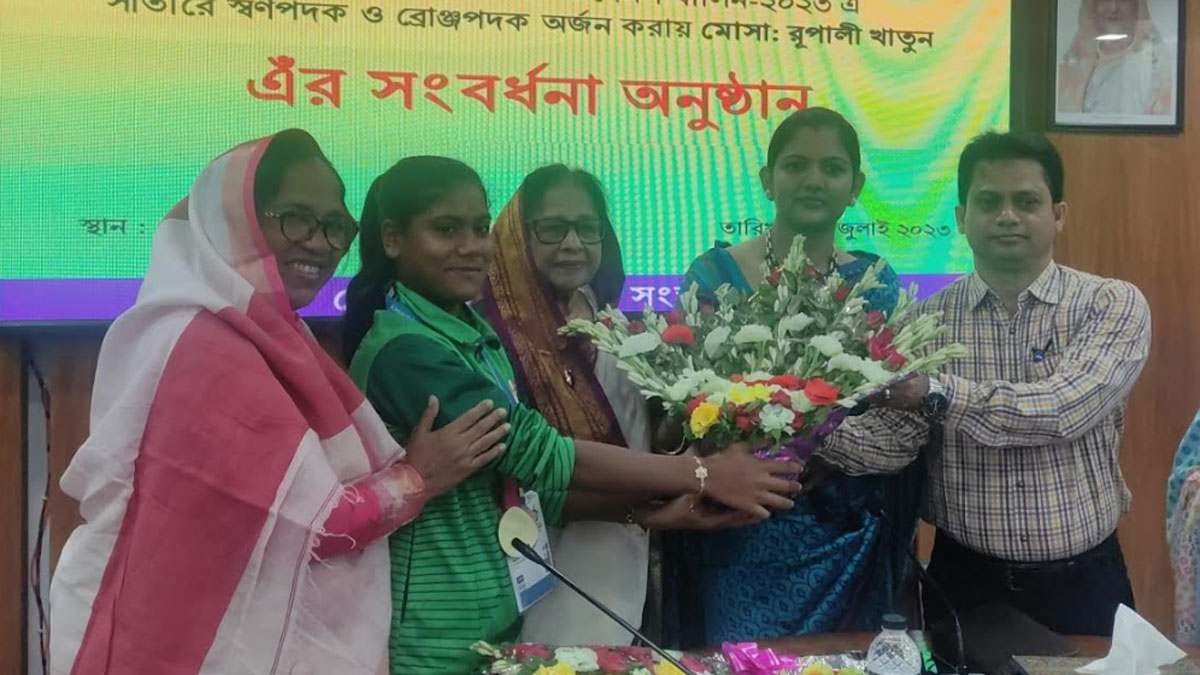 এর আগে স্বর্ণপদক জয়ী বাক প্রতিবন্ধী রুপালী খাতুনকে ফুলেল শুভেচ্ছা জানিয়ে ক্রেস্ট প্রদান করা হয় এবং জেলা প্রশাসকের পক্ষ থেকে নগদ ১০ হাজার টাকা উপহার স্বরূপ দেওয়া হয় তাকে।