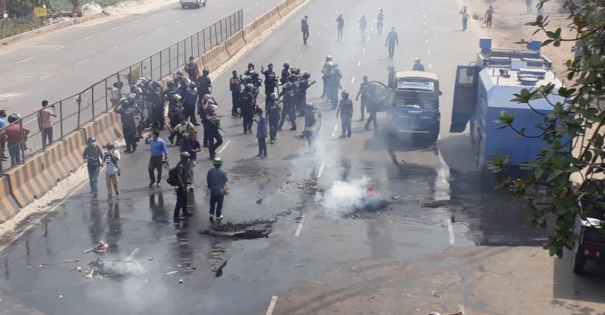 হেফাজত ইসলামের নেতাকর্মীদের পিকেটিং থামাতে নারায়ণগঞ্জের শ্যামপুরে ঢাকা-চট্টগ্রাম মহাসড়কে সতর্ক অবস্থানে আইনশৃঙ্খলা বাহিনী