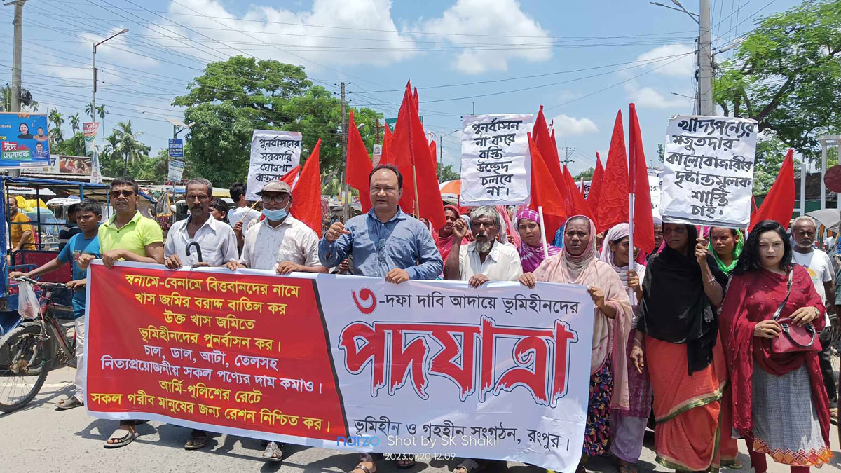 রংপুরে তিন দফা দাবি আদায়ে পদযাত্রা করেছে ভূমিহীন ও গৃহহীনরা। পদযাত্রা থেকে খাস জমিতে ভূমিহীনদের পুনর্বাসন, নিত্যপ্রয়োজনীয় সকল পণ্যের দাম কমানো ও আর্মি-পুলিশের রেটে গরিবদের জন্য রেশন ব্যবস্থা চালুর দাবি জানানো হয়।