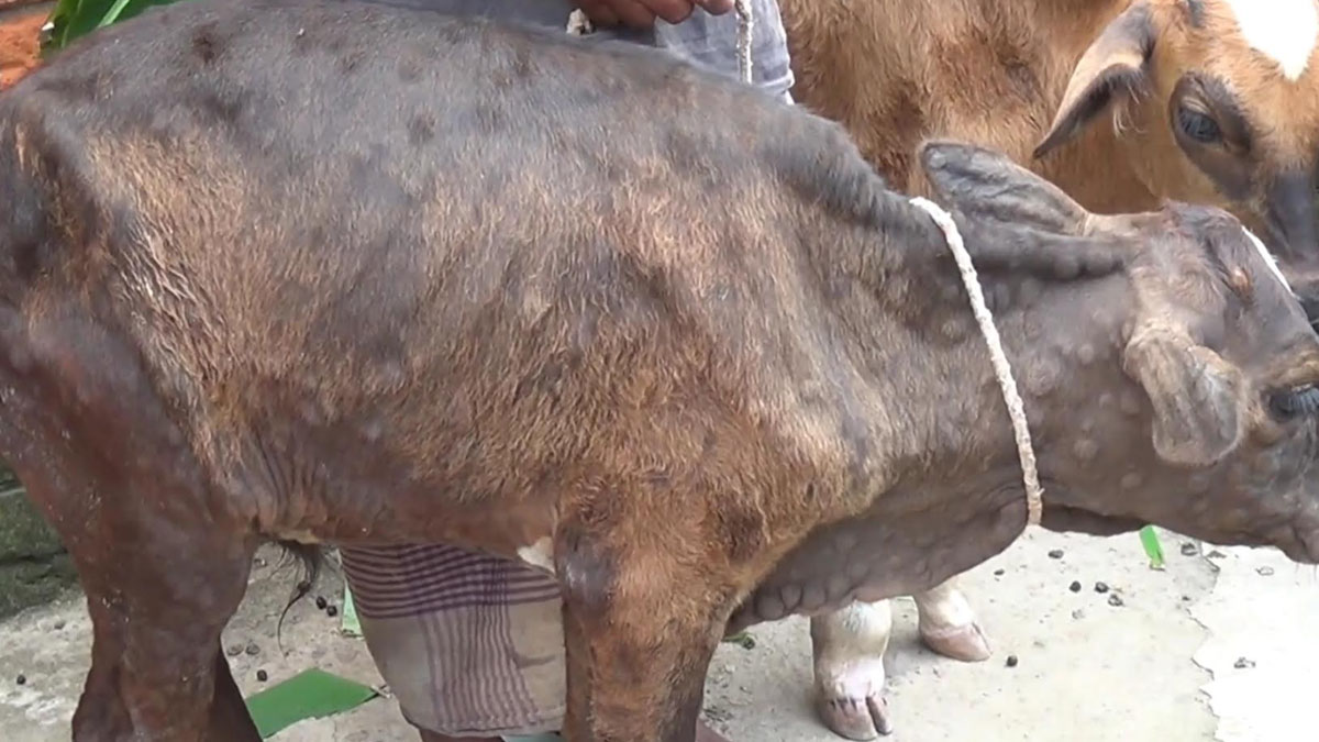 'গরুর শরীরের বিভিন্নস্থানে চামড়ায় গুটি গুটি দানা। গলা ও পা ফুলে জমছে পানি। শরীরে বইছে জ্বর আর প্রচণ্ড ব্যথায় শরীর বেঁকে যাচ্ছে। নাক-মুখ দিয়ে ঝরছে লালা। ঠিকমতো খেতে পারছে না। শরীর দুর্বল হয়ে অনেক গরু মারাও যাচ্ছে।'
