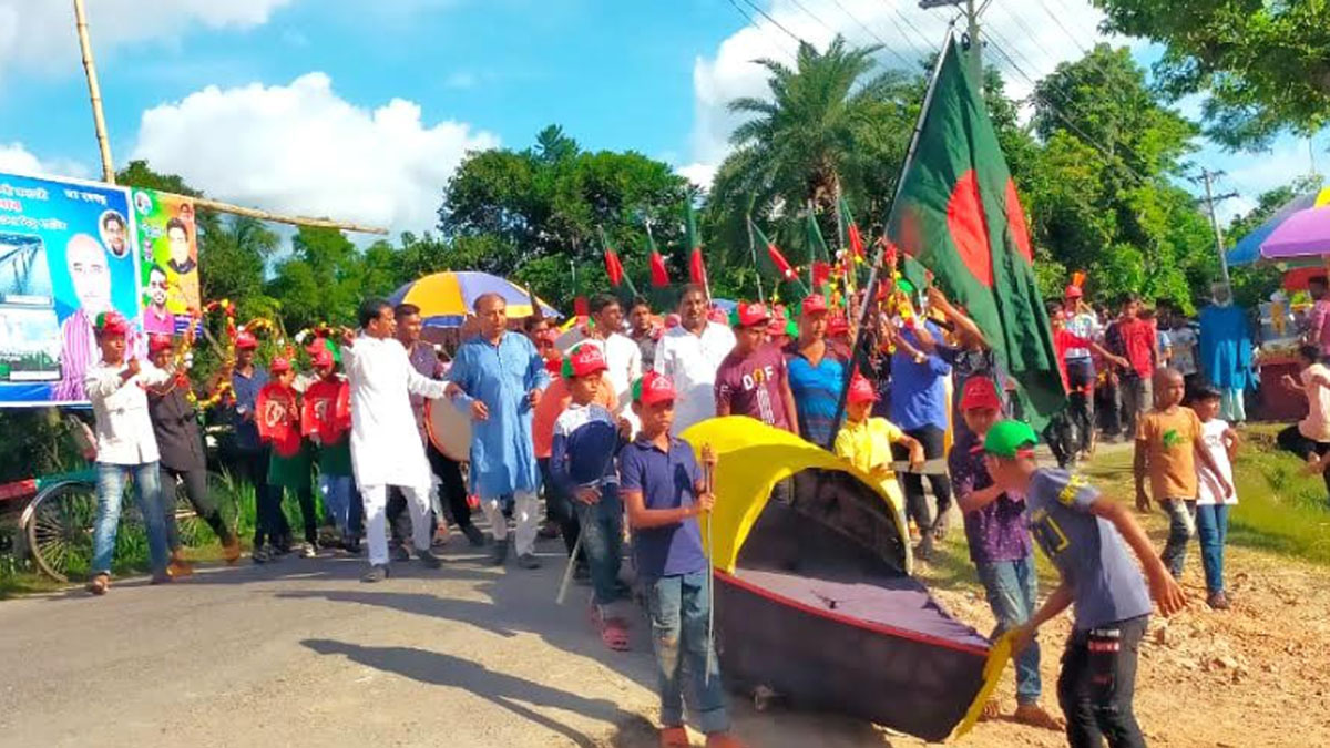 এতে দেখা যায়, মাঝখানে থেকে মিছিলের নেতৃত্ব দিচ্ছেন প্রধান শিক্ষক। বাম পাশে সভাপতিসহ অন্য একজন। এতে আরও দেখা যায় মিছিলের সামনে একটি নৌকা, আর সেটি ঠেলে আনছেন শিক্ষার্থীরা। আর বাদ্য বাজাচ্ছে স্কুলের ব্যান্ডদল।