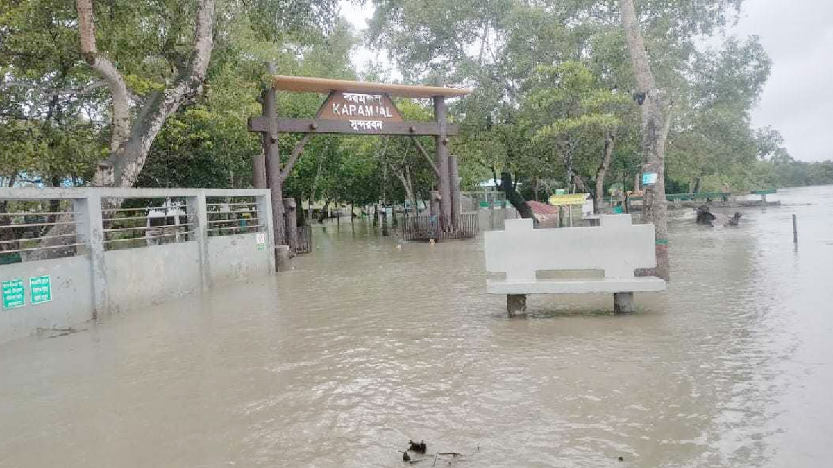 বঙ্গোপসাগরে সৃষ্ট লঘুচাপে ও পূর্ণিমার জোয়ারে পশুর নদীর পানি বৃদ্ধি পাওয়ায় তলিয়ে গেছে সুন্দরবনের বন্যপ্রাণী প্রজনন কেন্দ্রসহ বেশ কিছু এলাকা।