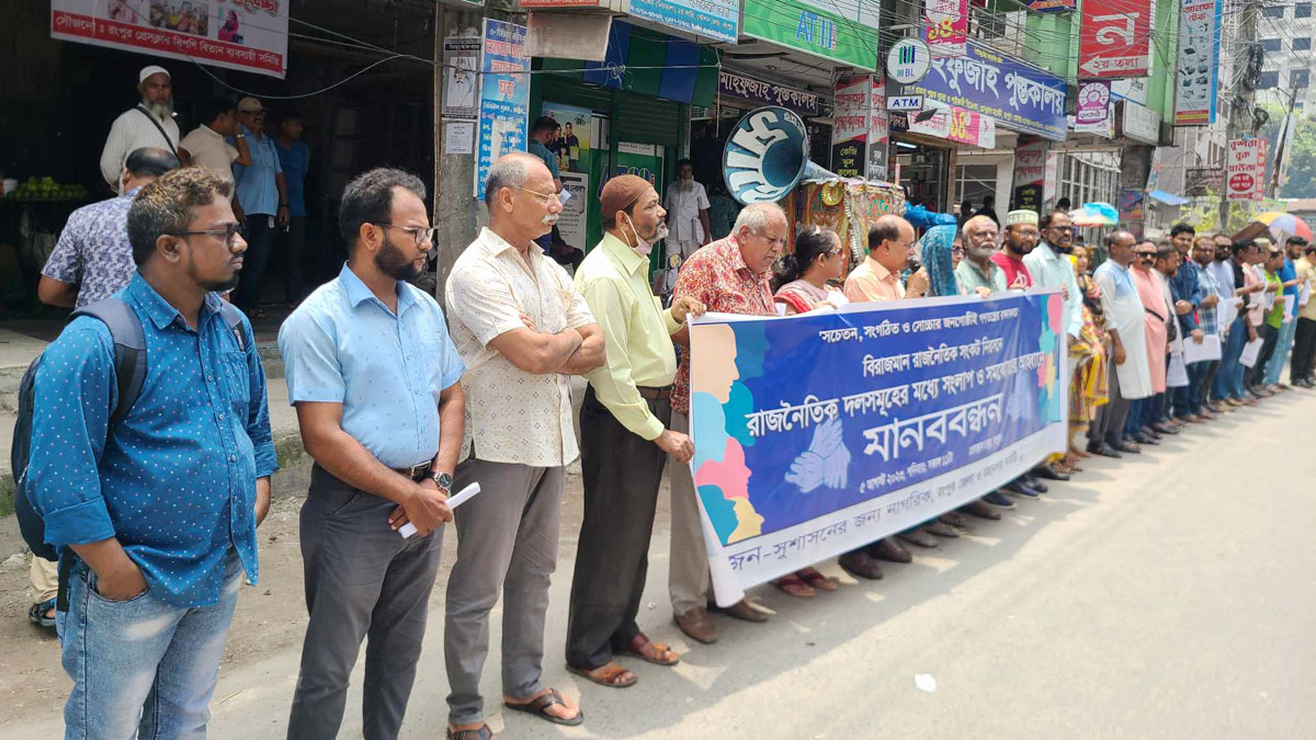 শনিবার (৫ আগস্ট) দুপুরে রংপুর প্রেসক্লাব চত্বরে অনুষ্ঠিত মানববন্ধন থেকে সচেতন নাগরিক ও বিশিষ্টজনরা এ মন্তব্য করেন। রাজনৈতিক দলগুলোর মধ্যে সংলাপ ও সমঝোতার আহ্বানে সুশাসনের জন্য নাগরিক (সুজন) রংপুর মহানগর ও জেলা কমিটি এই মানববন্ধনের আয়োজন করে।