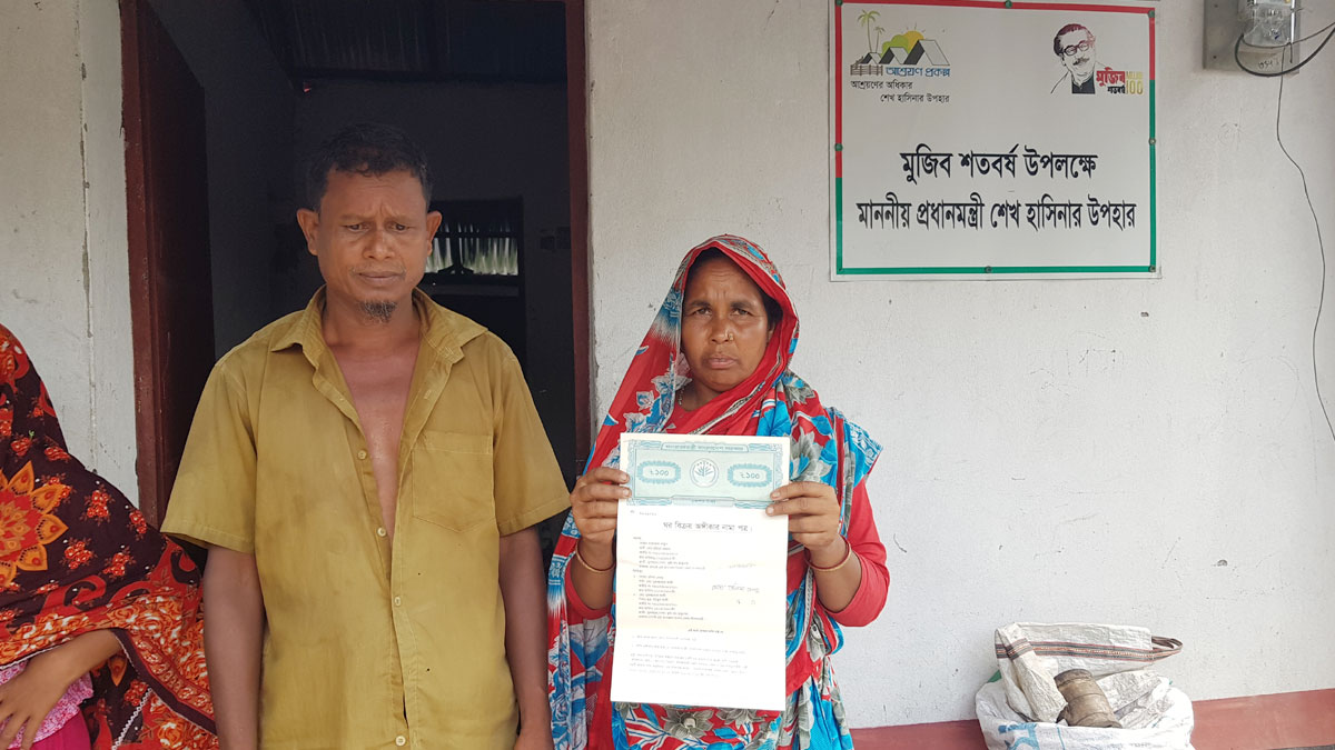 ৫৭ হাজার টাকায় কেনা আশ্রয়ণ প্রকল্পের ঘরে চুক্তিপত্র হাতে মমিনুর-মহছেনা দম্পতি। ছবি : ঢাকা পোস্ট