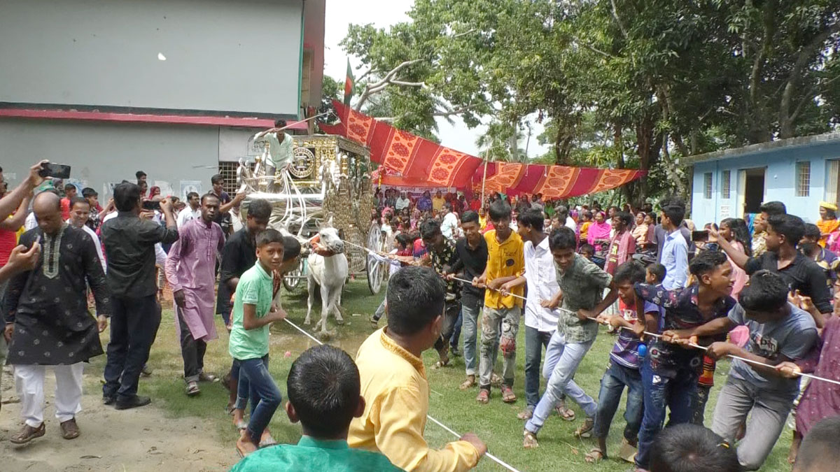 সুসজ্জিত ঘোড়ার গাড়িতে স্ত্রী সন্তানদের নিয়ে বসে আছেন শিক্ষক। কোচোয়ানে বসে আছেন তার আসনে। তবে গাড়ির নিয়ন্ত্রণ তার হাতে নেই। একদল কোমলমতি শিশু দড়ি টেনে ঘোড়ার গাড়ি এগিয়ে নিচ্ছেন সামনে। বৃহস্পতিবার (১০ আগস্ট) দুপুরে চাকরি জীবনের শেষ দিনে এক শিক্ষকের বিদায় অনুষ্ঠানে এমন ব্যতিক্রমী দৃশ্যের দেখা মিললো নওগাঁর বদলগাছী উপজেলার ভরট্ট সরকারি প্রাথমিক বিদ্যালয় প্রাঙ্গণে।
