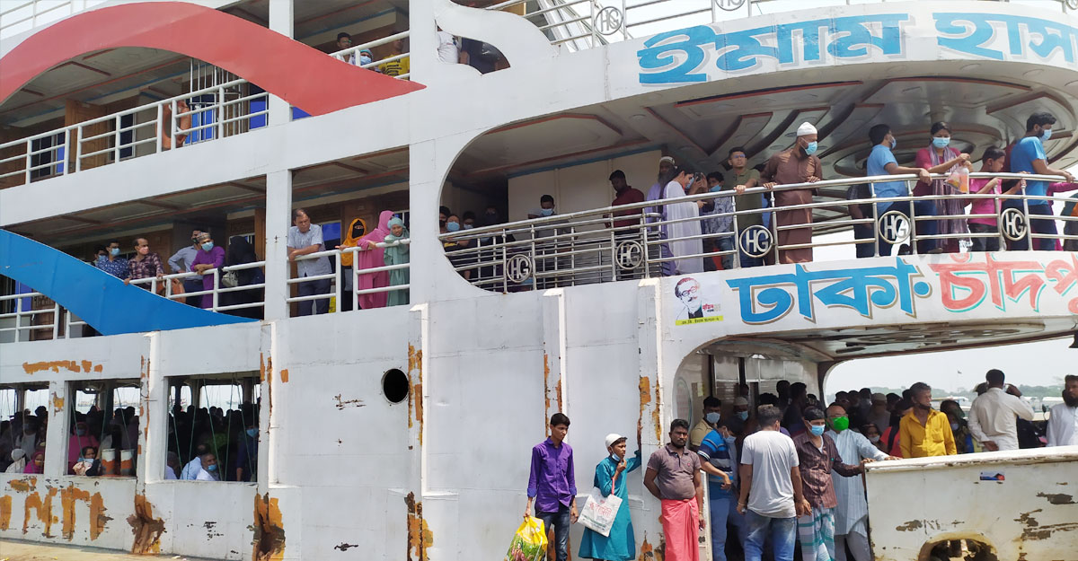 শনিবার (৩ এপ্রিল) সকাল থেকে দুপুর পর্যন্ত চাঁদপুর লঞ্চ টার্মিনালে গিয়ে দেখা যায়, যাত্রী চাপে ভেস্তে গেছে স্বাস্থ্যবিধি। লঞ্চে প্রবেশের সময় স্বাস্থ্যবিধি মানলেও ভেতরে গিয়ে সেই পুরনো চিত্র। ঠাসাঠাসি করে বসছে যাত্রীরা। ঢাকা থেকে চাঁদপুরে আসা ইমাম হাসান লঞ্চের ভেতরে যাত্রীর চাপে স্বাস্থ্যবিধ নেই বললেই চলে। লঞ্চকর্তৃপক্ষ যেমন উদাসীন, যাত্রীরাও নিয়মনীতি মানছে না। এ ভাবেই গাদাগাদি করে চাঁদপুর থেকে ঢাকা এবং ঢাকা থেকে চাঁদপুর আসছেন শিশু, বৃদ্ধ,ও রোগীসহ হাজারো মানুষ।