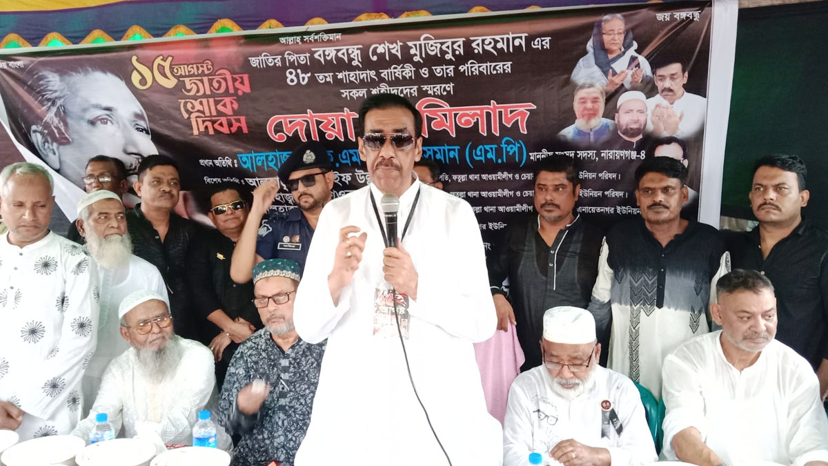 বুধবার (১৬ আগস্ট) দুপুরে নারায়ণগঞ্জের মাসদাইর এলাকায় জাতীয় শোক দিবস উপলক্ষ্যে বিশেষ দোয়া অনুষ্ঠানে অংশ নিয়ে তিনি এসব কথা বলেন। এ সময় স্থানীয়দের মাঝে রান্না করা খাবার বিতরণ করা হয়।