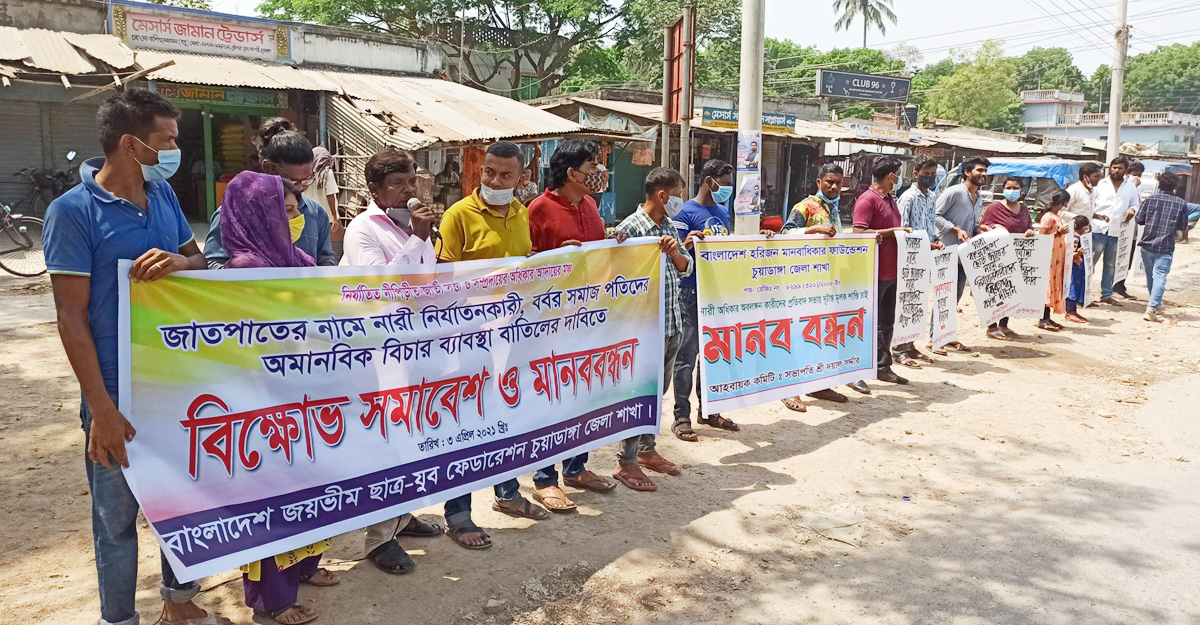 চুয়াডাঙ্গার আড়তপট্টি এলাকায় বিক্ষোভ-সমাবেশ ও মানববন্ধন করেছে বাংলাদেশ জয়ভীম ছাত্র-যুব ফেডারেশন চুয়াডাঙ্গা শাখা