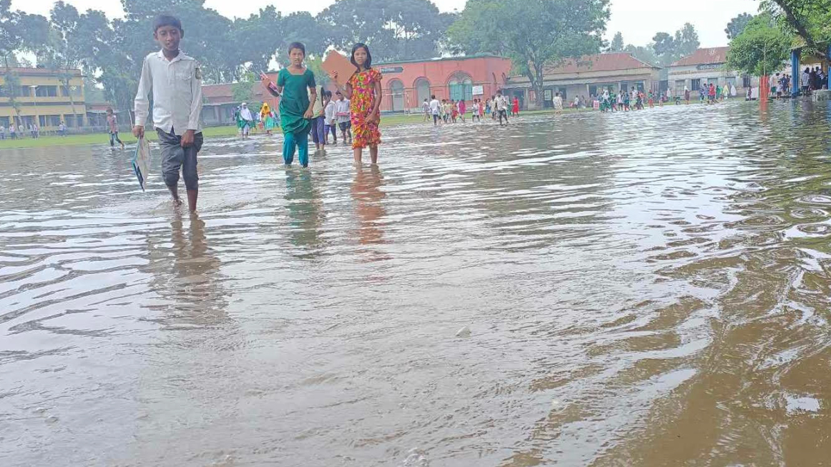 বৃহস্পতিবার (২৪ আগস্ট) সরেজমিন দেখা গেছে, বিদ্যালয়ের মাঠ নিচু হওয়ায় এবং পানি নিষ্কাশনের পথ না থাকায় মাঠটির বেশিরভাগ অংশই জলমগ্ন হয়ে আছে।