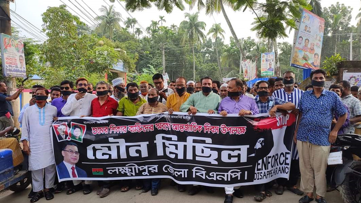গুমের শিকার ব্যক্তিদের স্মরণে আন্তর্জাতিক গুম প্রতিরোধ দিবস উপলক্ষ্যে লক্ষ্মীপুরে মুখে কালো কাপড় বেধে মৌন মিছিল করেছে বিএনপি। বুধবার (৩০ আগস্ট) বিকেল সোয়া ৫টার দিকে জেলা বিএনপির ব্যানারে এ আয়োজন করা হয়। এ সময় হাতে শিকল বেঁধে প্রতিবাদসহ গুমের শিকার নেতাকর্মীদের ফেরত চান তারা।